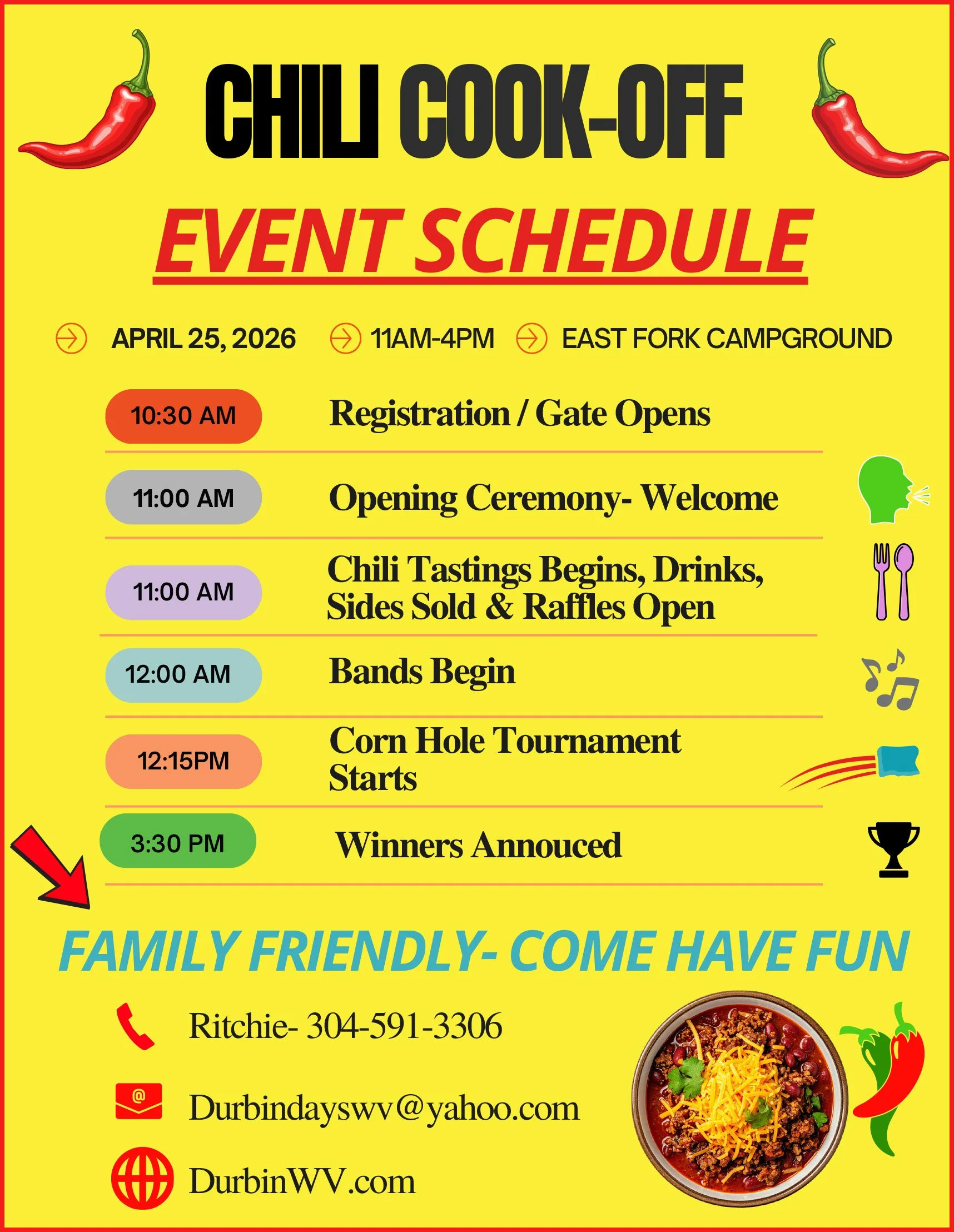 Participants can arrive early and MUST have their tent set up and chili warming at 10:30am. Testing starts at 11:00am.
